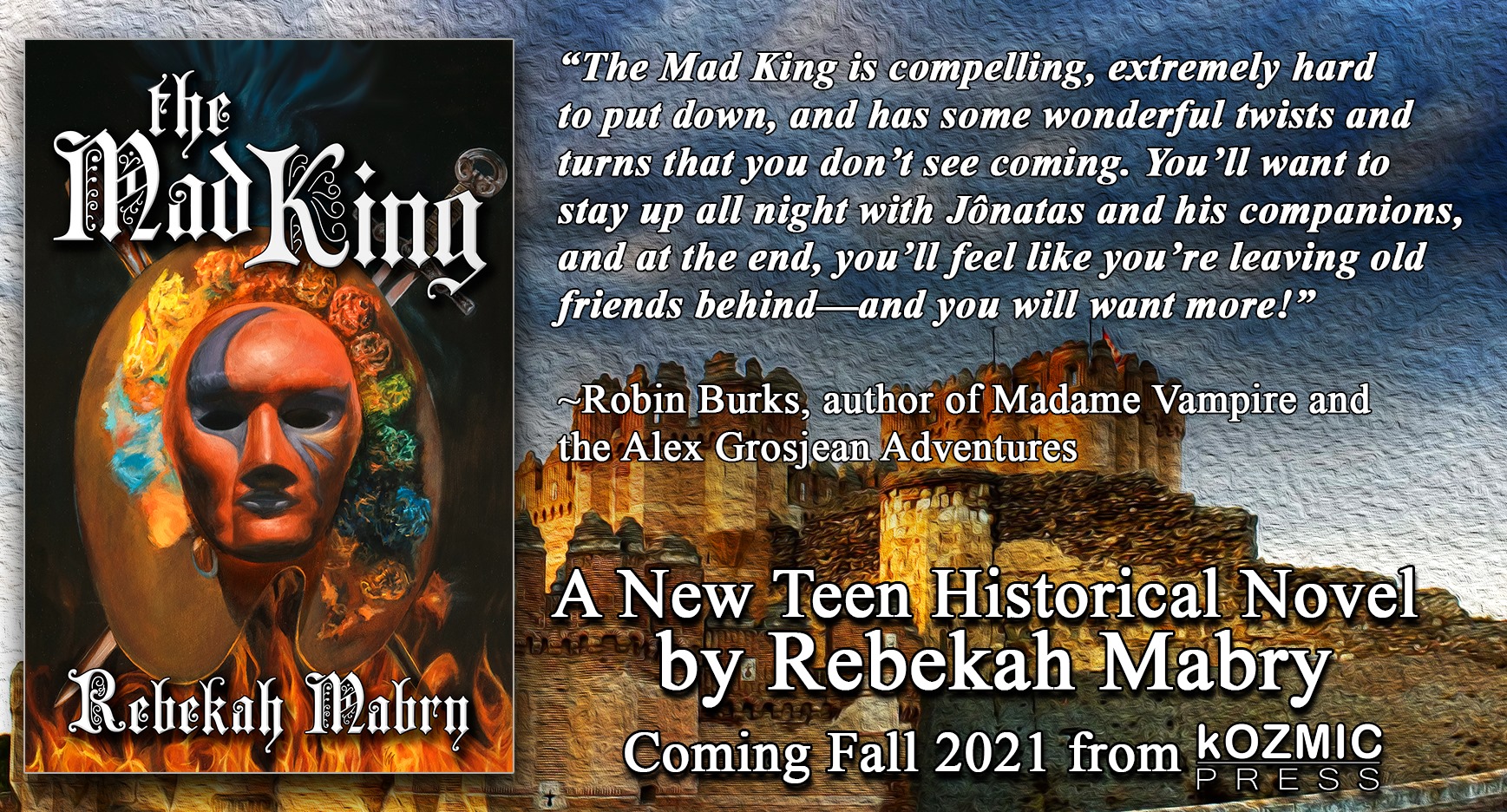 Our good friend Robin Burks, author of Madame Vampire and the Alex Grosjean Adventures, had some really amazing things to say about our upcoming Young Adult historical novel The Mad King by Rebekah Mabry. The Mad King will be release very soon! We can’t wait for you to read this debut novel, and we hope you love it as much as Robin did! While you wait for The Mad King, you should definitely visit Robin’s website and check out her titles!