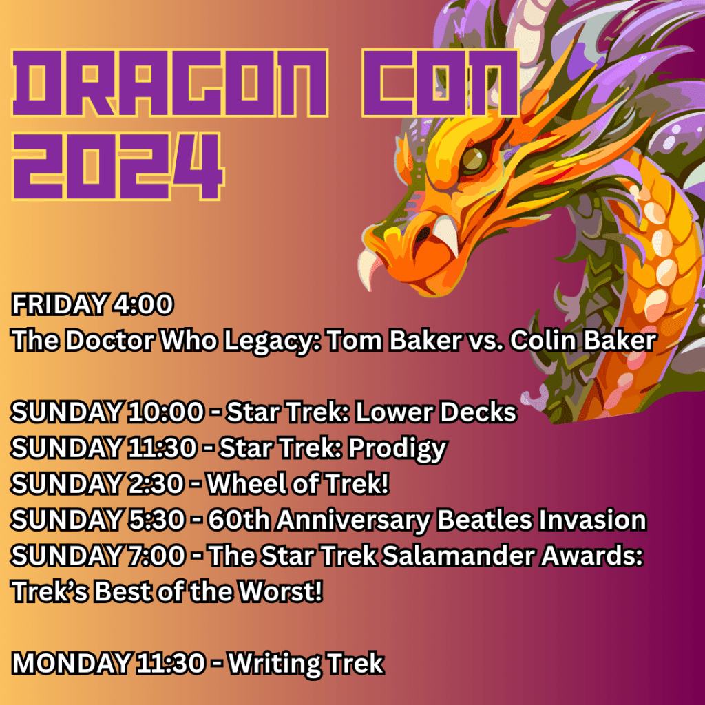 Author / Owner R. Alan Siler has a full schedule of panels at Dragon Con this year! All these panels are in the Hilton in two rooms directly across the hall from each other (that way he won’t get lost!). The Star Trek panels will be held in Galleria 2-3; the two British panels (Doctor Who and Beatles) will be in Galleria 5. If you attend any of these, please come say hello, and pick up info about upcoming titles (including how to submit for our Beatles book, She Wants to Tell You: The Stories of Women Inspired and Influenced by the Beatles), our podcasts, and more! Hope to see you there!