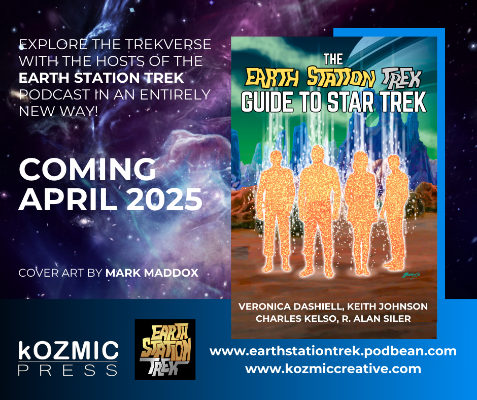 The co-hosts of the Earth Station Trek Podcast are pleased to announce their upcoming book, The EARTH STATION TREK Guide to STAR TREK! The book, written by Veronical Dashiell, Keith Johnson, Charles Kelso, and R. Alan Siler, will be a collection of essays, episode reviews, profiles, Top 10 lists, and more fun things that explore the Trekverse in a brand-new way! It will be making its debut APRIL 2025 (more details about that VERY soon)! And check out this incredible cover art by Rondo Award-winning artist Mark Maddox!