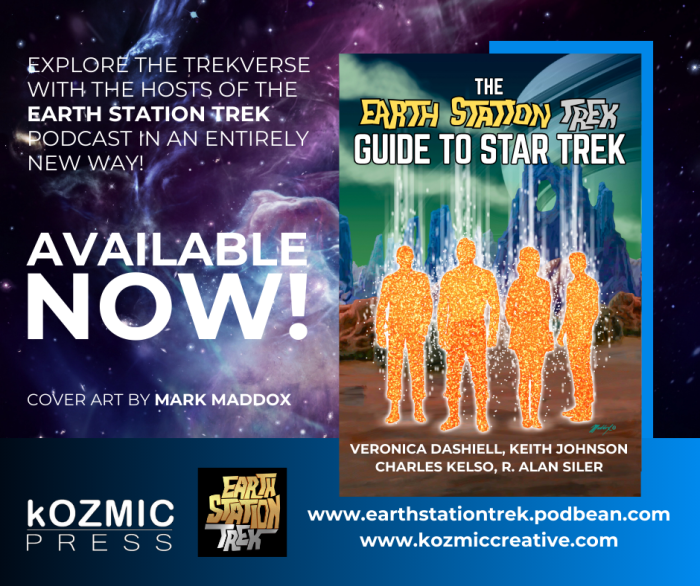 The hosts of the EARTH STATION TREK Podcast announce their new book: The EARTH STATION TREK Guide to Star Trek. This new book will feature 20 new essays by the four hosts (Veronica Dashiell, Keith Johnson, Charles Kelso, and R. Alan Siler) on a wide range of Trek-related topics both personal and observational, plus profiles of each host, best-of lists, an episode guide, and more.